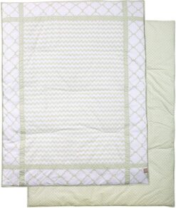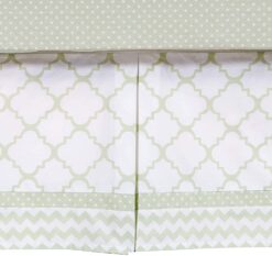 In a cool mix of green and white, this 3-piece crib set makes a chic, gender-neutral statement in the nursery. A reversible 100% cotton quilt features chevron stripes framed by quatrefoil and dots in sea foam green and white. The quilt is backed in a sea foam green and white dot for versatility. The 100% cotton fitted crib sheet is in sea foam green and white dot and fits a standard 52″ x 28″ crib mattress. 8″ deep pockets with elastic around the entire opening ensure a secure fit. A box pleat crib skirt with 15″ drop has a coordinating quatrefoil print with chevron trim and dot accent in sea foam green and white. Matching sea foam crib bumpers, room accessories and gift items by Trend Lab sold separately.