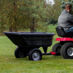 This Troy-Bilt Poly Swivel Dump Cart is ideal for large hauling jobs around your yard, farm or estate. The 15 cu. ft. premium-quality structural foam poly bed will hold an impressive 1000 lbs. Upon activation of the foot pedal dump release, the bed tilts and swivels to empty the load anywhere within a 105° radius. Convenient spring-loaded hitch pin with integrated handle allows for easy hook-up to riding mowers and zero turn mowers equipped with pin hitch receiver. Hauls mulch, dirt, rocks, firewood and other gardening, farming and landscaping materials with ease.