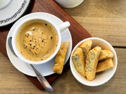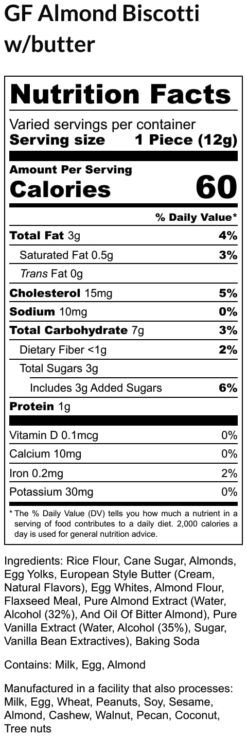 Rice Flour, Sugar, Whole and Diced Almonds, Eggs, Egg Yolk, Butter, Almond Flour, Flaxseed Meal, Baking Powder, Pure Vanilla Extract, Pure Almond Extract.