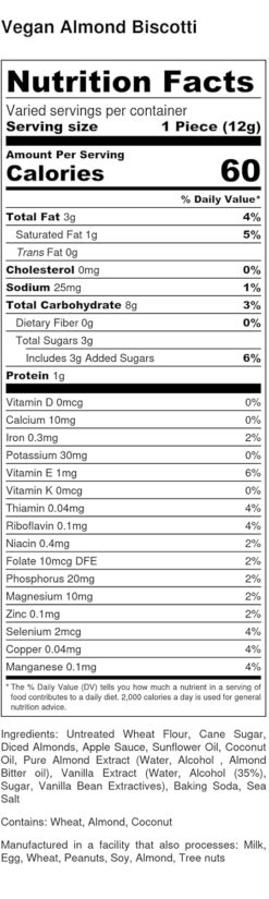 Untreated Wheat Flour, Pure Cane Sugar, Diced Almonds, Apple Sauce, Sunflower Oil, Coconut Oil, Pure Almond Extract, Pure Vanilla Extract, Baking Soda, Sea Salt.