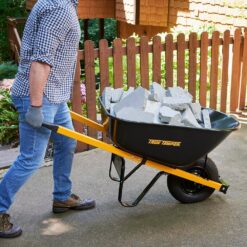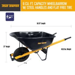 With 6 cu. ft. of hauling capacity, the True Temper “Barrow in a Box” Steel Tray Wheelbarrow is ideal for homeowners, landscapers and light construction work. The 6 cu. ft. seamless steel tray is plenty tough and will provide years of service for just about any job. The solid, never-flat tire never requires air, so your wheelbarrow is always ready to work. Around the house or on the job, this is the right wheelbarrow for the job. This unique wheelbarrow is designed for convenience to ship in 1 durable box, with quick and easy assembly.