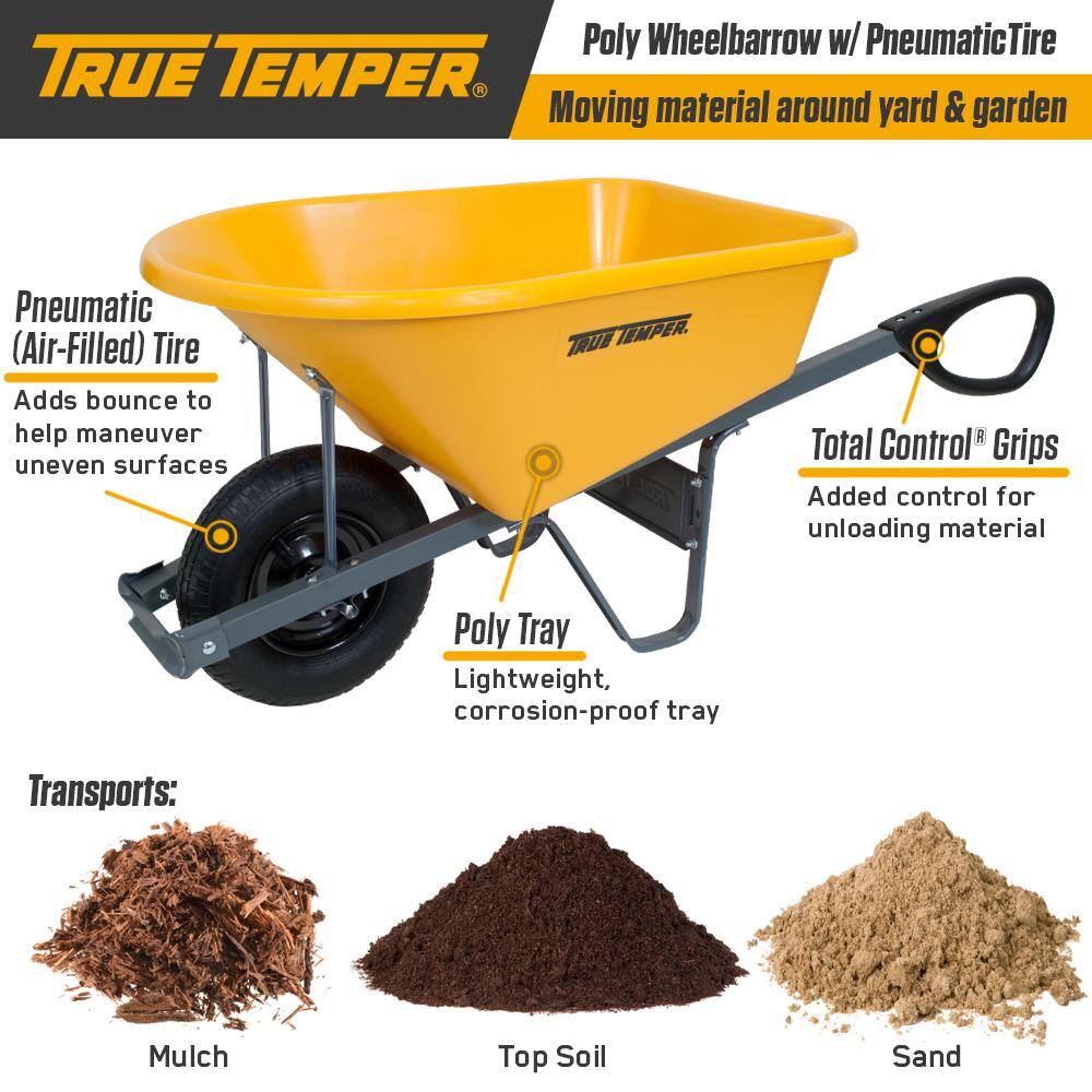 This 6 cu. ft. True Temper poly wheelbarrow is perfect for lots of jobs around the yard. Going uphill or down, moving across level ground or dumping a heavy load, innovative Total Control handles from True Temper deliver superior control and maneuverability. Engineered using strong steel handles and tough poly resin, Total Control is as durable as it is functional. At last, a wheelbarrow innovation that really works.