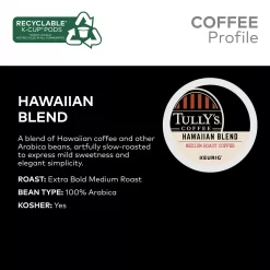 We keep it slow and low at Tully’s Coffee. An uncommonly delicious coffee forged in the fires of an unconventional process. Tully’s Coffee gets its distinctive aroma and rich, full flavor from our signature low and slow roasted process that imbues that taste of true craftsmanship into every sip. Tully’s Coffee Hawaiian Blend is a blend of Hawaiian coffee and other Arabica beans, artfully slow roasted to express mild sweetness and elegant simplicity. Made with a blend of Hawaiian coffee and other Arabica beans. An uncommonly delicious coffee forged in the fires of an unconventional process, Tully’s Coffee gets its distinctive aroma and rich, full flavor from our signature low-and-slow roasting process that imbues that taste of true craftsmanship into every sip. Single-serve Tully’s Coffee K-Cup pods are compatible with all Keurig K-Cup pod single-serve coffee makers. Certified Orthodox Union Kosher.