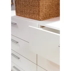 Keep it clean. Loft 8 Drawer Double Dresser can organize your clothing without overbearing your room. With 8 wide drawers, sweaters and lines find a happy home here. Unique dresser depth makes the Loft ideal for smaller spaces or high traffic areas in bedrooms. Streamlined hardware and round feet give the Loft line its simple chic feel. Standing strong with metal drawer liners and an easy to clean foil surface the Loft dresser will be a productive and durable piece in your collection. Pair this Loft 8 Drawer Double Dresser with other items from the Loft collection to complete the look