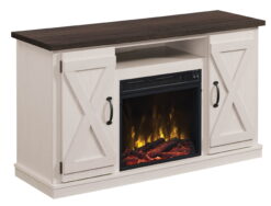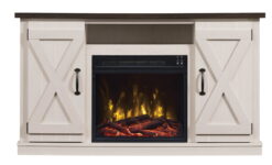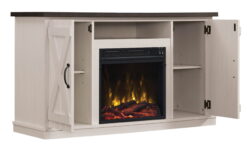 With the Twin Star Home Modern Farmhouse TV Stand for TVs up to 55″ with Electric Fireplace, you can enjoy stylish, modern farmhouse design while accommodating your flat screen TV of up to 55 inches and 40 pounds during your family movie nights. An open media shelf holds your cable box, gaming console, or other AV components while side cabinets with adjustable shelves provide storage your movie collection and electronic accessories. The cabinets and TV stand top feature a plank design with decorative saw cut X mullions on the doors for added rustic flair. For even more ambiance, use the electric fireplace to create a cozy atmosphere while warming up to 400 square feet of your home. The flame effects can be used with or without heat for the look of a gentle rolling fire all year long, even during warmer months. Choose between included contemporary fire crystals or a realistic log set with ember bed to showcase the beautiful flames.