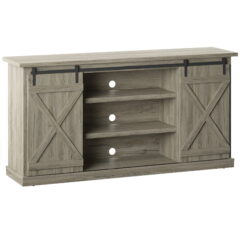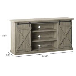 With this modern farmhouse TV stand that features real sliding barn doors, you can add on-trend style to your living room and have a place to hold your flat screen TV of up to 70 inches and 70 pounds. Suspended doors glide smoothly along metal rail hardware and feature rustic mullions to make this piece something special. The two side cabinets have two adjustable shelves each and the open, center shelf area has two adjustable shelves as well. The result is tons of storage space for cable boxes, DVRs, game consoles, other AV equipment, and even knick-knacks you love. Holes in the back panel manage cord routing to prevent tangles and add ventilation to cool electronics. If you’re looking to upgrade your entire living room, be sure to see the rest of the collection, including a matching accent cabinet, storage bench, and console table.