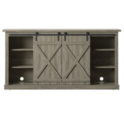- Barn style doors glide along metal rail hardware for easy access to center shelves as well as side storage cabinets for storing gaming systems, cable boxes and other AV components