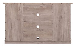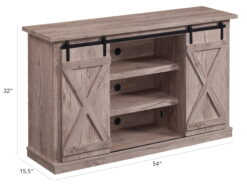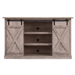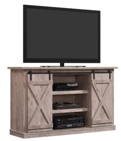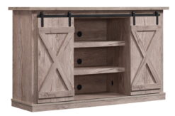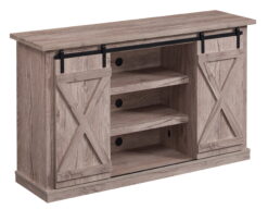 With the Terryville TV stand, you make a wise investment to hold your flat-screen TV up to 60 inches and to add a great look to your home. Suspended barn-style doors that slide on a metal rail, plus a distinctive rustic finish make this piece something special. The sliding doors conceal two cabinets with two adjustable shelves each, and the open, center shelf area has two adjustable shelves as well. The result is tons of storage space for cable boxes, DVRs, game consoles, other audio-visual equipment, and even knick-knacks you love. Holes in the back manage cord mess and add ventilation to cool electronics.
