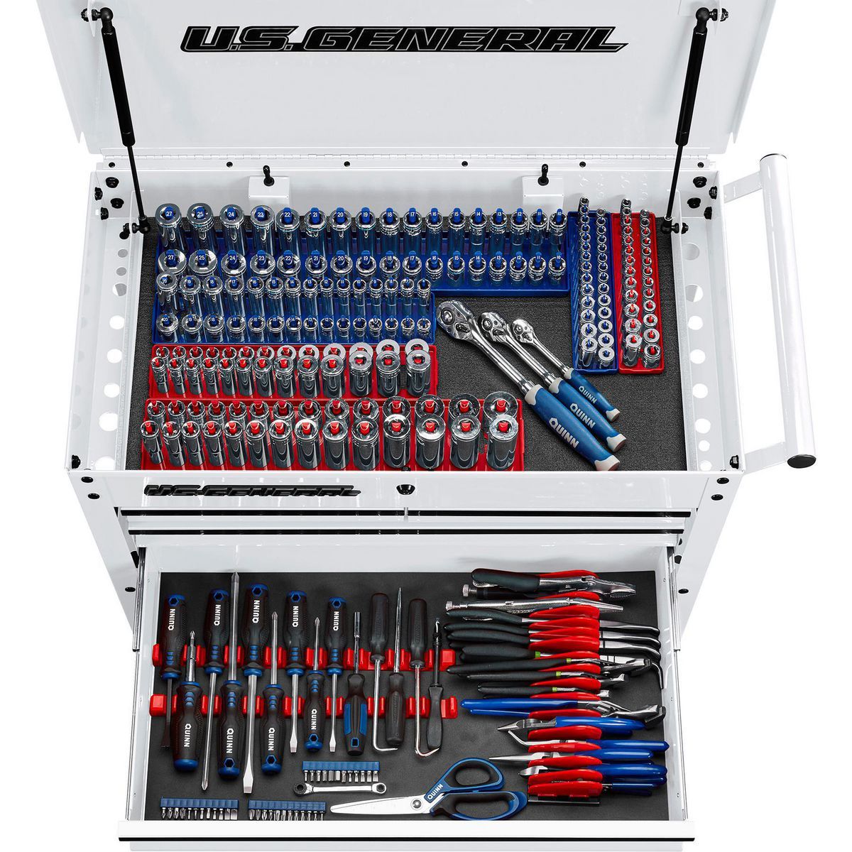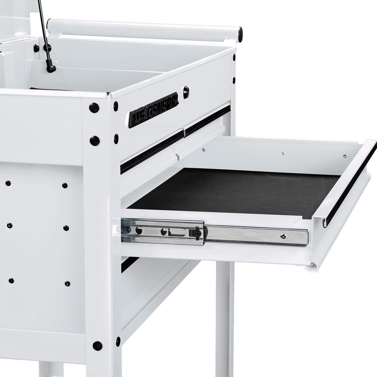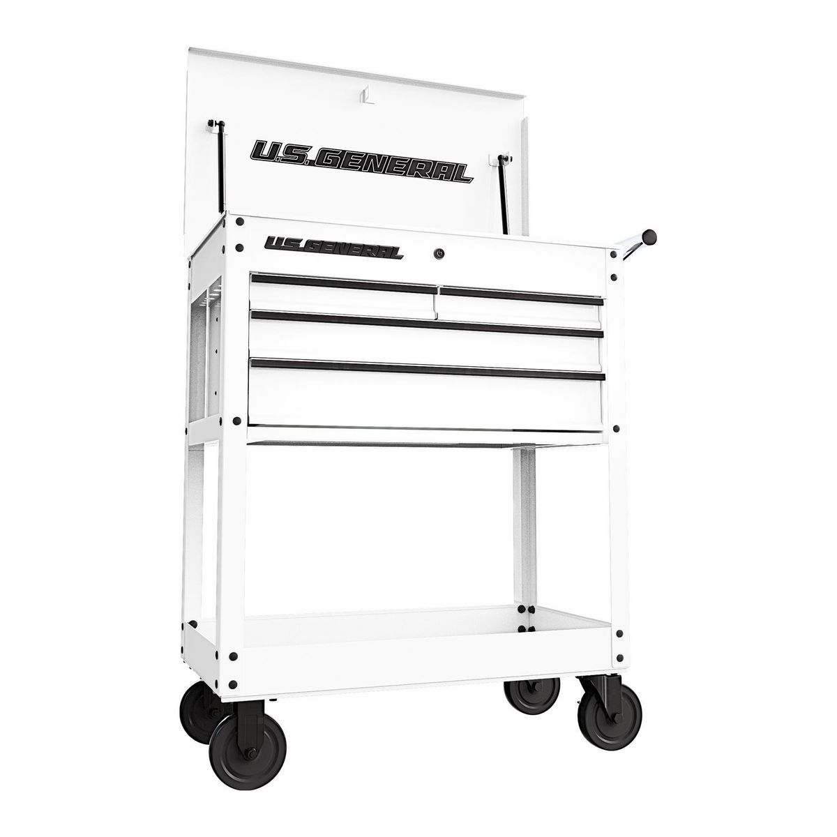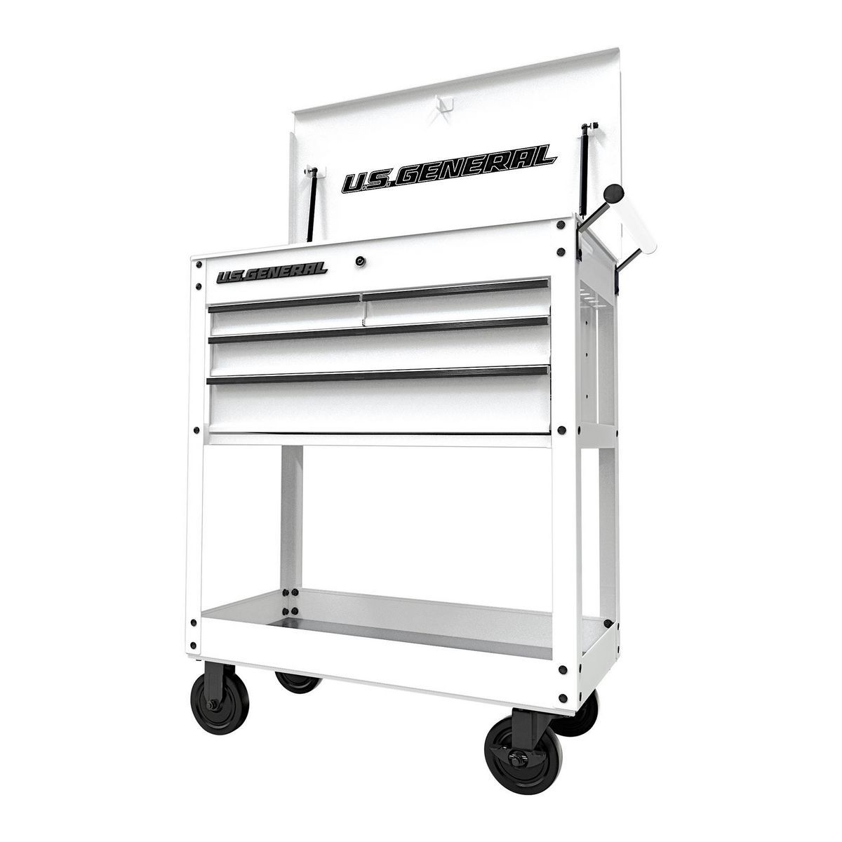 The U.S. GENERAL® 30 in., 4-Drawer Tech Cart is optimized for tool storage with 12,600 cubic inches of total storage volume, 4500 cubic inches of lockable storage, and a weight capacity of 580 lb. This cart has rolled-edge drawers, nonslip drawer liners, side can holder, and integrated pry bar holders for use in local automotive shops or your own garage. All U.S. GENERAL® carts are rigorously tested in our state-of-the-art testing facility in the USA to meet the highest quality standards.