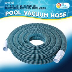 - Professional heavy duty 1-1/2″ (38mm) x 25 foot (7.5m) spiral-wound swimming pool vacuum hose with kink-free swivel cuff.