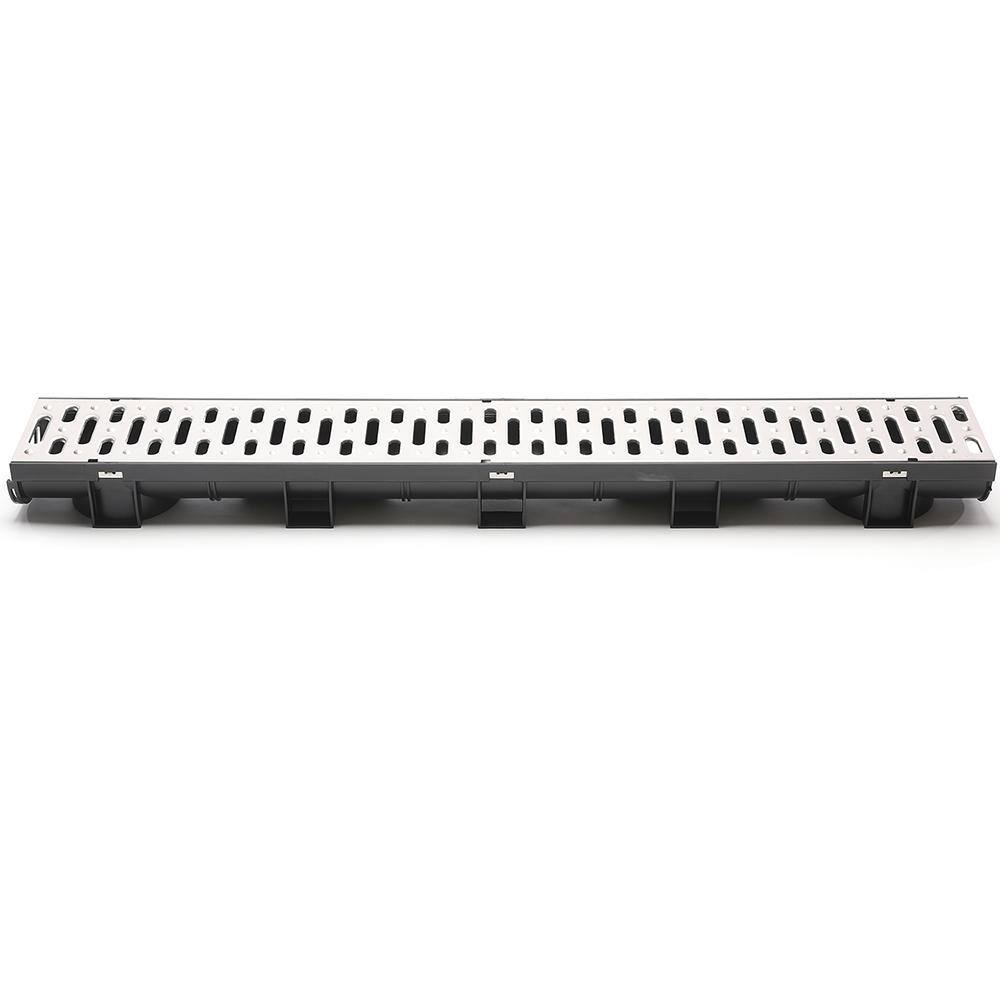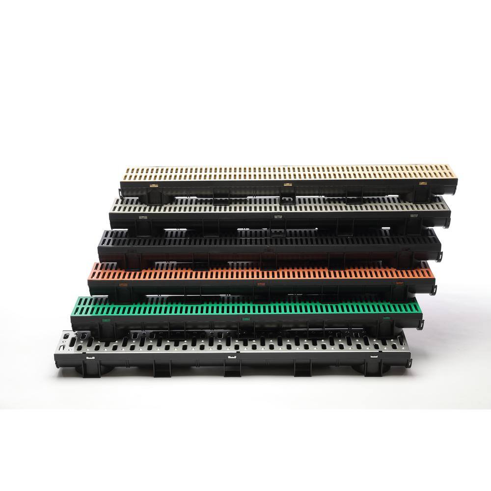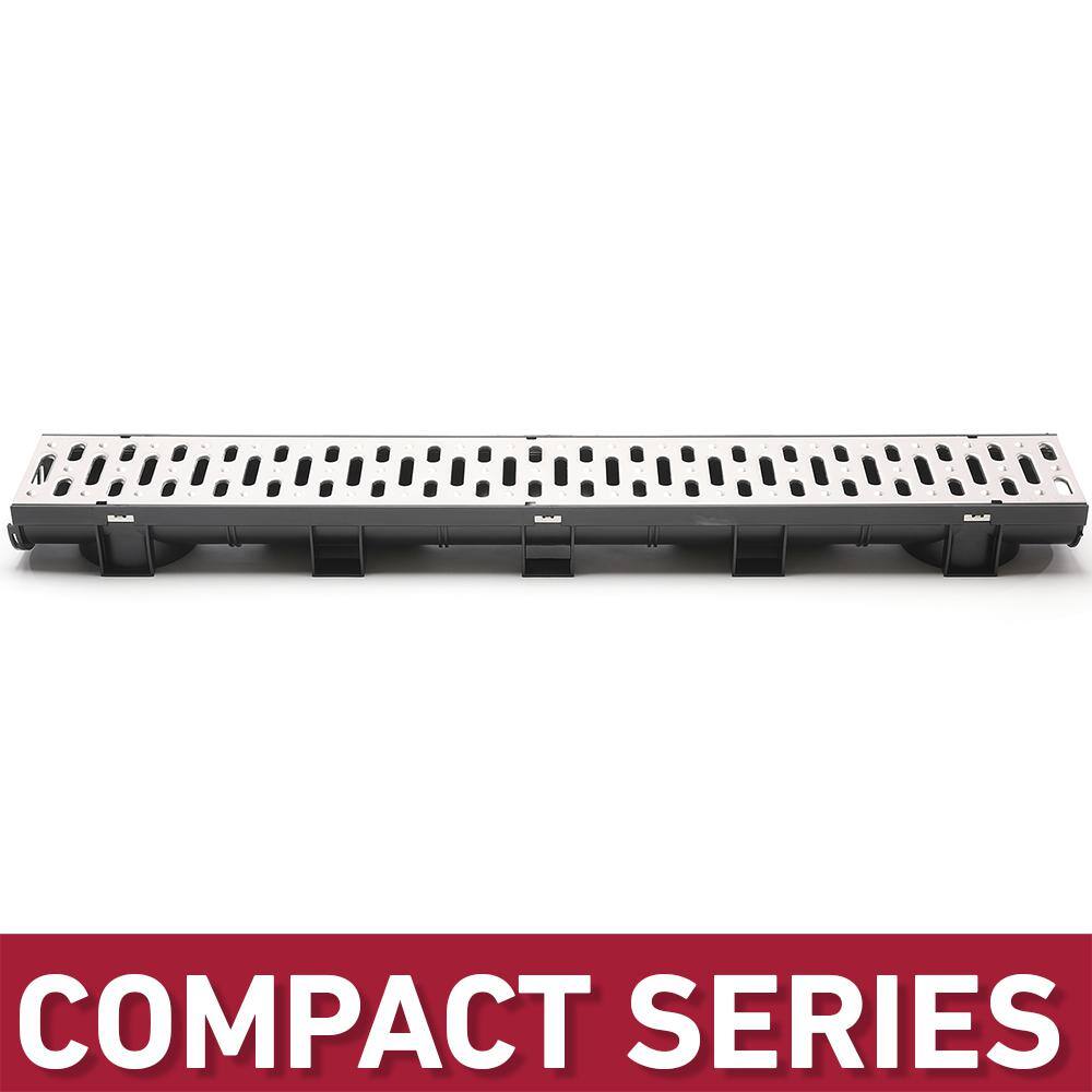 Because of their low-profile design, the Compact Series Modular Trench Drain systems are perfect for low water flow areas in landscape water drainage projects. Optimal for deviating rainfall water and flowing or stagnant water on property where water tends to collect and pool. Adjacent to homes or at the bottom of sloped areas; Trench Drains provide flexible drainage solutions. Residential uses include yard water drainage for small-grassed suburban properties or large acres of land and farm areas. Easily collect and disperse water from patio areas or pool sides. Commercial water drainage systems allow safe and efficient drainage for office buildings, property, or factory interiors. The flat grates are designed to distribute weight to the drain edges, and the smaller slats are ideal for walking on without worrying about high-heeled shoes getting caught. The bottom of the system contains cut-out section for 3 in., 3.5 in. or 4 in. drainage pipes. The compact Trench Drain is visually appealing due to its sleek, yet sturdy, construction and adds an aesthetic touch it its surroundings. Available accessories include end caps, adaptor pieces, convertor pieces, 90 corner pieces, storm water pits, and alternative grates.