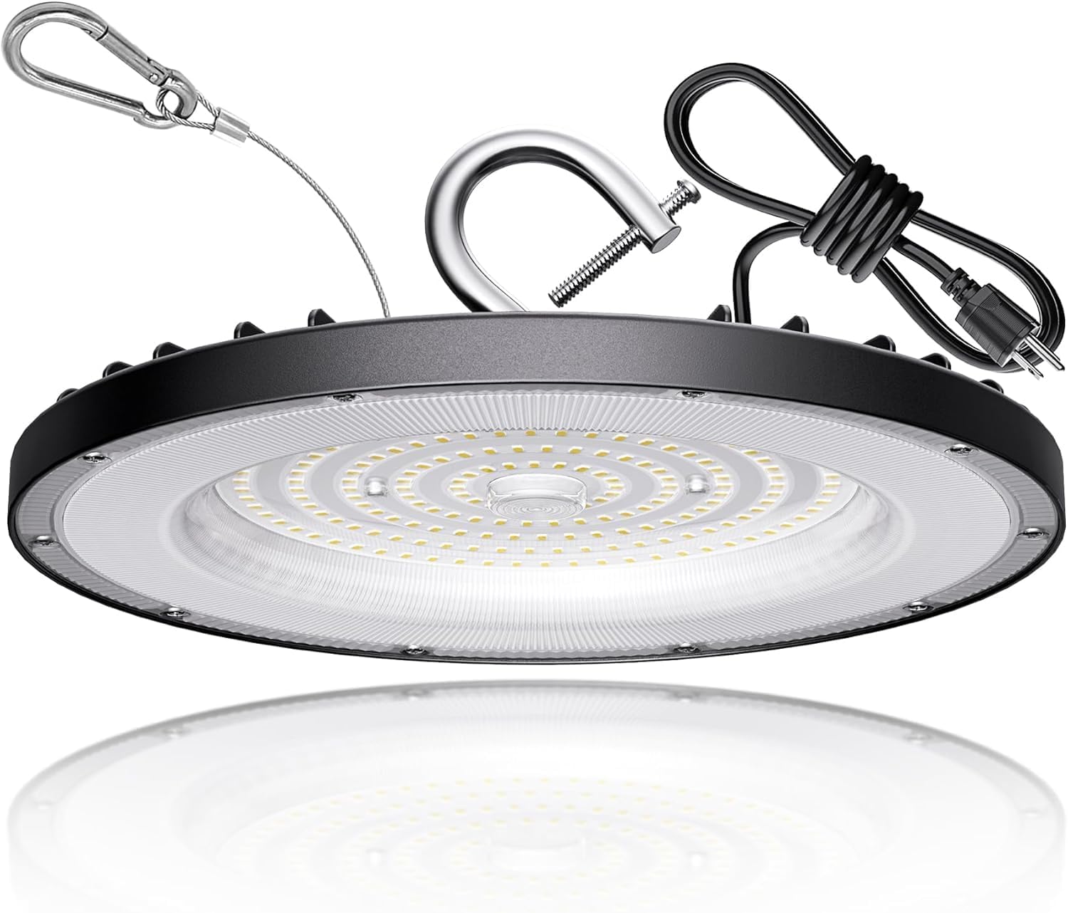 - 1 Minute Installation: This high bay ceiling light includes the 5ft cable, US ground 3-prong plug, safety rope and hook, you just need 3 steps to install it. First, hang it in the ceiling hook, Then connect the safety rope, at last plug it in to an outlet, it is perfect for you to solve your problem such as short cable, unsafe etc, also you need not spend too much time or effort on installation