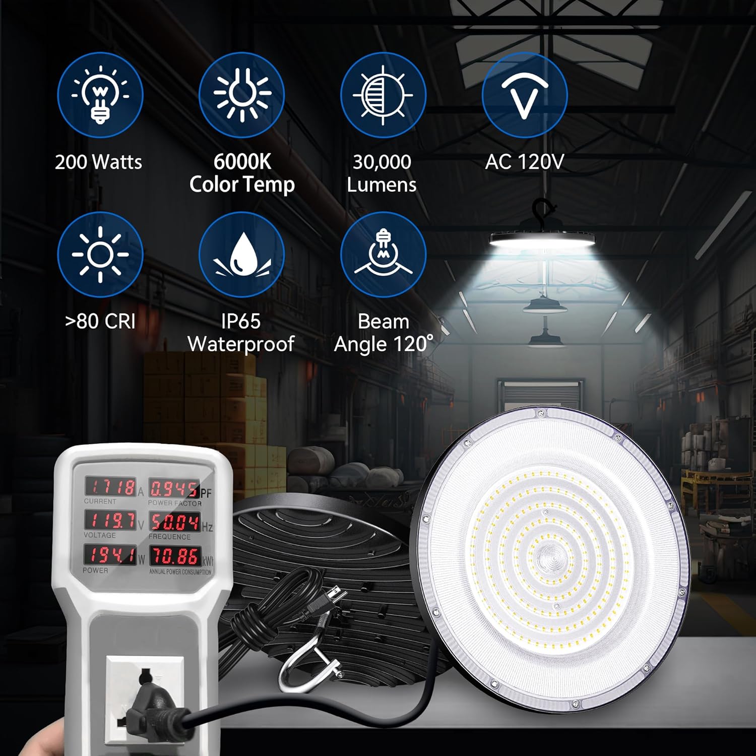 UFO Led High Bay Light 200W(800W MH/HPS Equiv.), 30000lm, 6000K Daylight High Bay Led Light with 5′ Cable US Hook, IP65 Waterproof Commercial Light Fixture for Warehouse Workshop Barn Factory