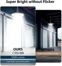 - 【High Quality Light Source】:This UFO led high bay lights 5000k light fixture has high quality and powerful SMD3030 LED chips, which provides 30000lm output, equivalent to 800W HPS.