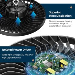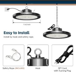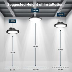 - 【Superior Heat Dissipation】: The shell of this high bay shop light is entirely made of aviation aluminum. By utilizing advanced airflow design concepts, the overall heat dissipation is reduced, thereby improving the lifespan of the lighting fixtures.