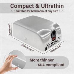 UL Listed and ADA Compliant Thin Automatic Electric Commercial Hand Dryer for Bathrooms,Heater ON/OFF Switch,High Speed,Brushed SUS304 Cover,Wall Mount.