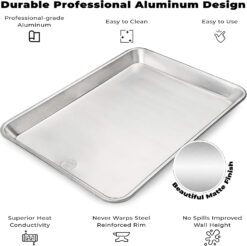 - BUILT TO LAST: Our aluminum half sheet pan is durable, food-safe, warp-resistant, and rust-resistant for professional baking. Ultra Cuisine’s aluminum baking pans are designed with premium aluminum for superior baking and a specialized reinforced steel rim to prevent warping. The aluminum half sheet pan measures exterior 17.9 x 12.9 x 1.3 inches and interior 17.08 x 12.4 x 1.3 inches.