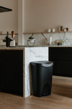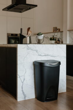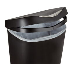 With its contoured lines and attractive satin finish, Brim provides an unexpected level of style that will compliment your kitchen decor. Brim features a stainless-steel foot pedal, that triggers the innovative soft-close lid system, and a retention ring that holds the trash bag firmly in place while concealing it. The wide-top design makes garbage bag removal easy, while the polypropylene construction makes it durable and sturdy – perfect for residential or commercial use. Measuring 17 x 25.5 x 13 inches (43 x 65 x 33 cm), Brim has a 13-gallon (50L) capacity that supports most garbage bag types including draw-sting and flap-tie bags. U.S. Patent No. D673,750