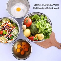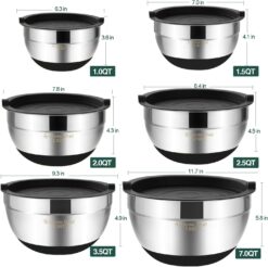- [LARGER BOWL SIZES]: Our stainless bowls deeeper than standard bowl sets, allow for larger servings . This set contains sizes1.5, 2.0, 2.5, 3.5, 7 quarts, that gives you much more flexibility, and less mess, satisfy your demands for mixing large batters, tossing salads, washing vegetable, marinating and storing, etc