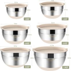 - [LARGER BOWL SIZES]: Our stainless bowls deeeper than standard bowl sets, allow for larger servings . This set contains sizes1.5, 2.0, 2.5, 3.5, 7 quarts, that gives you much more flexibility, and less mess, satisfy your demands for mixing large batters, tossing salads, washing vegetable, marinating and storing, etc