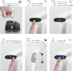 - How to Use: Step1,Add water;Step2,Plug in the power supply and touch the power switch on the LCD display.Wait for 30 seconds. When the switch stops flashing, it means that the preheating is complete.Step3,Touch the LCD display and select steam;Step4,Turn the lock mist button on the front of the garment steamer to release steam all the time;Step5,After ironing, press and hold the power button for 2 seconds. The indicator light will go out and the device will stop working.