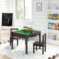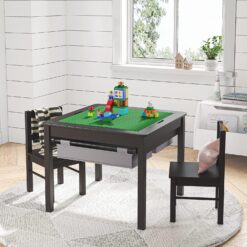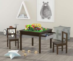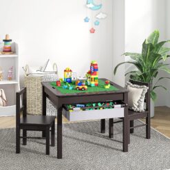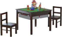 UTEX Wooden 2 in 1 Kids Construction Play Table and 2 Chairs Set with Storage Drawers, and Built in Plate Compatible with Lego and Duplo Bricks (Espresso with Grey Drawer)