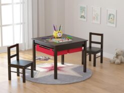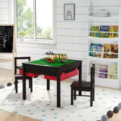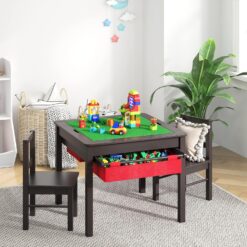 UTEX Wooden 2 in 1 Kids Construction Play Table and 2 Chairs Set with Storage Drawers, and Built in Plate Compatible with Lego and Duplo Bricks(Espresso with Red Drawers)