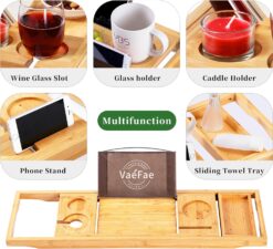 VaeFae Bamboo Bathtub Caddy Tray, Expandable Bath Tray for Tub with Upgraded Wine Slots and Book Holder – Ideal for One or Two Person Use