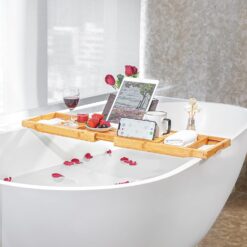 - 【Optimized Bath Organizer】 Our versatile bathtub caddy tray is designed with a foldable stand for book and iPad, special slot for wine glass, another round compartment for candle and bottle, and a sliding tray with draining holes for towel and soap. Perfect to hold all your bath stuff