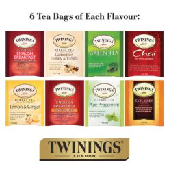 Enjoy this hand-selected assortment of delicious Classic Tea offerings from the Master Blenders of Twinings. Our decorative gift box contains six tea bags of each: English Breakfast Black Tea, Camomile, Honey & Vanilla Herbal Tea, Chai Black Tea, Green Tea, Lemon & Ginger Herbal Tea, English Breakfast Decaffeinated Black Tea, Pure Peppermint Herbal Tea, Earl Grey Black Tea