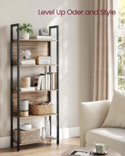 - [Stay Organized in Style] Elevate your space with this 9.4″D x 24.4″W x 65″H industrial bookshelf. It offers 5 large, warm-toned storage shelves to organize your books and decorations, all while adding aesthetic appeal to your home decor