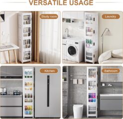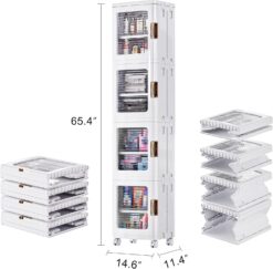 VECELO 4-Tier Plastic Tall Narrow Storage Cabinet with Movable Wheels, Adjustable Shelves, Magnetic Doors, Slim Bathroom Organizers and Storage for Small Space, Bathroom, Kitchen, Laundry, White (14.6 x 11.4 x 65.4 In)