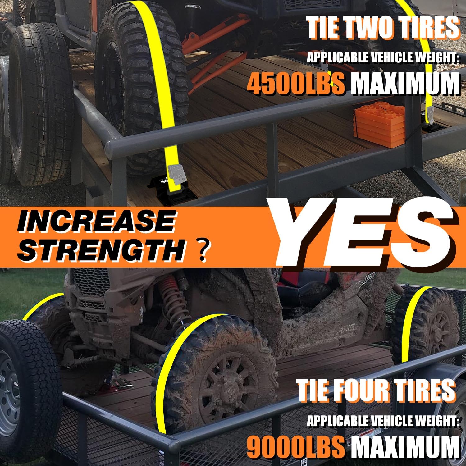 Vehicle Wheel Chock Tie Down kit 4500lb Break Strength-4 Pack 2″ x9′ E Track Straps-Ultimate Heavy Duty Trailer Tire Strap System for ATV,UTV,Lawn Mower