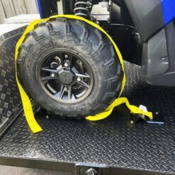 - EASY TO INSTALL-Simply ride your ATV up and over the chocks installed on the floor until the tires slip into place between the chocks. Wrap the E-Track straps around the tires and snap them into E-Track slots on the wheel chocks. Ratchet tight, and get on the road!