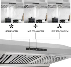 - 【Powerful Dual Motors & 850cfm Suction】Equipped with dual motors and a 6” top-round vent, this under cabinet range hood provides strong and efficient suction to effectively remove smoke, steam, and cooking odors from your kitchen.