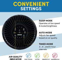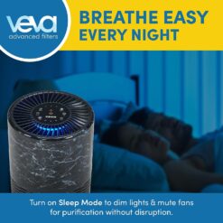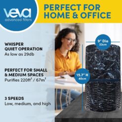 - BREATHE EASY: Veva’s Circular Style Air Purifier helps you relax and breathe easily with fresh, clean air in the home. It offers 220 sqft of coverage with a three-speed setting and quiet operation for a peaceful environment. A soft light and easy on/off button interface make it perfect for night use.