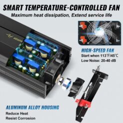VEVOR 5000-Watt Pure Sine Wave Power Inverter. 12-Volt to 120-Volt, Aluminum Alloy Shell and Easy Remote Control. Are you ready to confidently power up your electronics. This pure sine wave inverter is highly recommended for sensitive electronic equipment that requires cleaner AC power to operate effectively. Clear LCD display, intelligent cooling fan, and multiple protections provide reliable power conversion in a compact size and high efficiency. It allows you to power up multiple devices such as laptops, fans, fridges, microwave ovens, notebook computers, switching power supplies, coffeemakers, etc. Let’s power it up together.