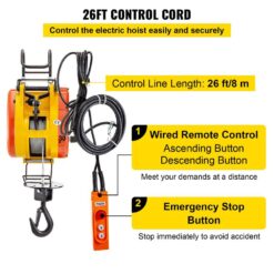 - 26 ft. control cord: our electric hoist with remote control is achieved through a handle switch, the length of the cable: 26 ft. control the host with ascending and descending buttons at a long distance, furthermore, this switch provides an extra emergency stop button to manage accidents immediately when something goes wrong