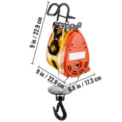 - 507 lbs. load capacity: the electric hoist lifts small engines, transmissions, or building supplies quickly, for secure working, this hoist supports extensive loading with a security latch steel hook, the capacity and speed of this machine are 507 lbs., 52.5 ft./min
