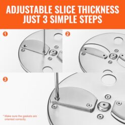 Enjoy Effortless Meal Prep with VEVOR Electric 4-in-1 Vegetable Slicer: Say goodbye to the hassle of knife work in your kitchen endeavors! This efficient 4-in-1 electric vegetable slicer tackles slicing, shredding, dicing, and julienning effortlessly; With interchangeable blades, it swiftly transforms vegetables, fruits, and cheese into perfect slices or dices, ideal for crafting delicious salads, soups, pizzas, corn fritters, desserts, and more; Adjustable cutting thickness and size ensure uniformly thick and neatly edged slices, making it the perfect prep assistant for both home and commercial kitchens;; [Package Content] 1 x Vegetable Slicer; 1 x Slicing Disc & Blade (4 Gaskets, adjustable thickness 1-5 mm); 2 x Shredding Disc & Shredding Blade (2 mm, 3 mm); 2 x Dicing Disc & Dicing Blade (6 x 6 mm, 12 x 12 mm); 1 x Slitting Blade (10 x 10 x 90 mm); 2 x Cut-Resistant Gloves; 1 x Cleaning Brush; 1 x Wrench; 1 x Cleaning Tool; 1 x Food Pusher; 1 x User Manual
