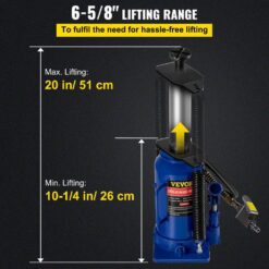 - 6-5/8 in. lifting range: with its powerful pneumatic and hydraulic power, our bottle jack can lift a maximum of 20-Ton/44092 lbs. and has a lifting range of up to 10-1/4 in. to 20 in.