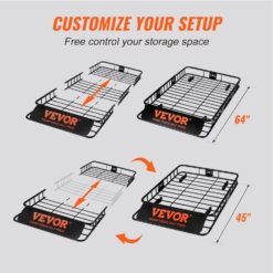 - Versatile Size Options: Experience ample storage space atop your vehicle with our spacious 64 x 39 x 6-inch roof rack cargo carrier. By freeing up room inside your vehicle, you can accommodate your family and friends comfortably. Moreover, our cargo basket offers adjustable dimensions, ranging from 64x39x6 inches to 45x39x6 inches, allowing for a perfect fit on various vehicles and adapting to your evolving storage needs.