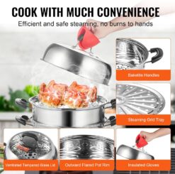 - Food-Grade 304 Stainless Steel: VEVOR food-grade 304 stainless steel steamer – built to last with its durable and sturdy construction, while the well-polished mirror surface enhances thermal conductivity for efficient heating. 0.5mm thickened pot wall prevents deformation, and the anti-oxidation protective layer also keeps the food steamer rust-free and easy to clean.