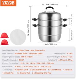 VEVOR Steamer Pot 11in/28cm, 3 Tier Steamer Pot for Cooking with 8.5QT Stock Pot, Vegetable Steamer & 2 Steaming Tray, Food-Grade 304 Stainless Steel Food Steamer Cookware for Gas Electric Stove Grill