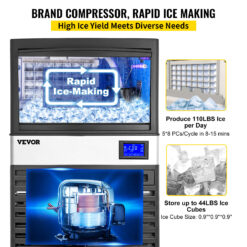 VEVORbrand 110V Commercial Ice Maker 110 lbs/24H with 44 lbs Bin and Electric Water Drain Pump, Clear Cube, Stainless Steel Construction, Auto Operation, Include Water Filter 2 Scoops