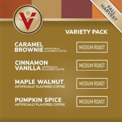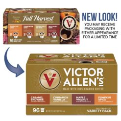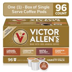 - Contains 1 box of 96 pods of Victor Allen’s Coffee Fall Harvest Single Serve Pod Variety Pack (Flavors Included: Maple Walnut, Caramel Brownie, Cinnamon Vanilla Walnut, Pumpkin Spice; 96 pods total)