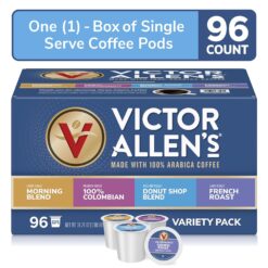 - Contains 1 box of 96 pods of Victor Allen’s Coffee Single Serve Coffee Pod Variety Pack (Flavors Included: Morning Blend, 100% Colombian, Donut Shop Blend, French Roast; 96 pods total)