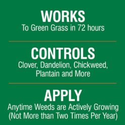 - Controls over 50 listed lawn weeds, including clover, dandelion, plantain, morning glory, chicory, evening primrose, and purslane