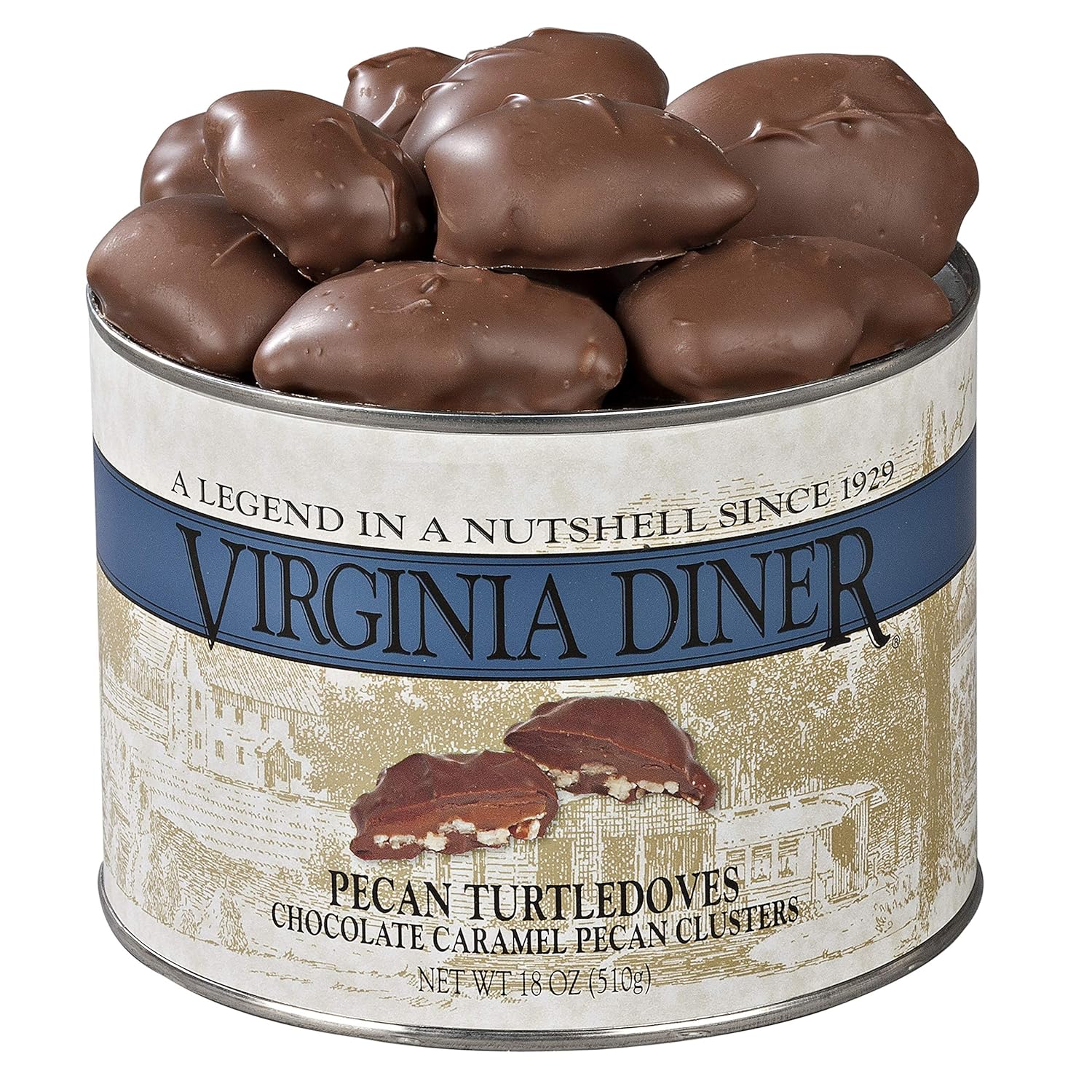 Virginia Diner Classic Pecan Turtledoves Gourmet Chocolate Caramel Pecans (18 Ounce Tin Pecan Turtledove 1.12 Pound Pack of 1) Chocolate Covered Pecans, Pecan Turtles Food Gifts