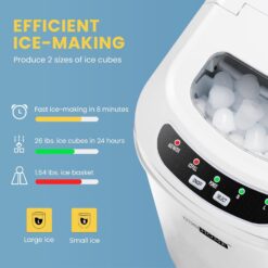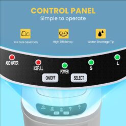 - 2 SIZES OF ICE CUBES – Simply select the ice size (S/L) on the control panel to meet your different preferences and requirements; The intelligent LCD panel of the ice maker allows you to complete any operation easily without complex; You can monitor the ice-making process and check the water level from the see-through window; It also comes with indicators to give you an alarm when the reservoir is low and when the ice bucket is full